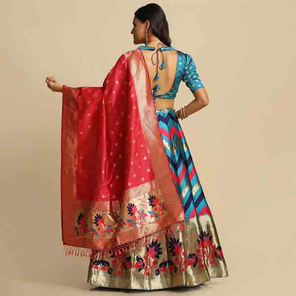lehenga fabric: jacquard silk || inner fabric: crepe || choli fabric: jacquard silk || dupatta fabric: jacquard silk || lehenga length: 42 inch || choli size: 0.8 mtr || dupatta width: 38 inches/ 0.95 meter , dupatta length : 2.15 meter/ 84.64 inches|| lehenga work: gold woven work || choli work: woven work || dupatta work: gold woven work