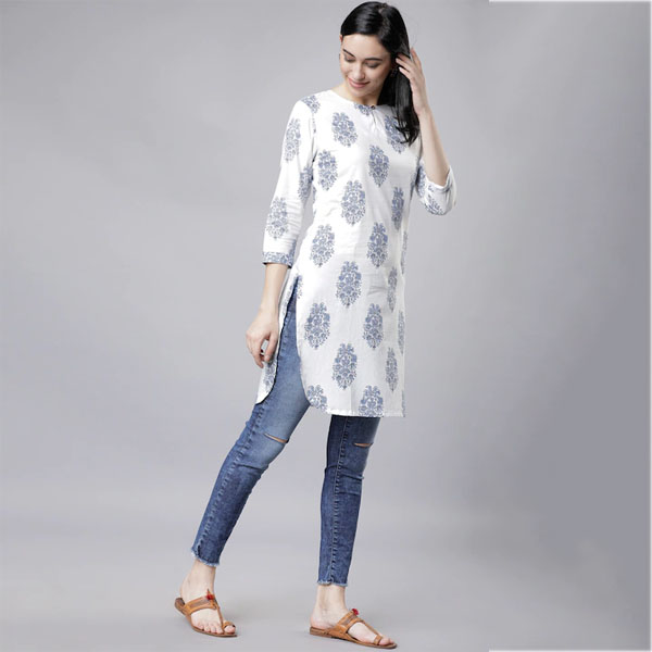 - Blue and white paisley printed tunic, has a round neck with tie-up detail, three-quarter sleeves, lace inserts detail and flounce hem